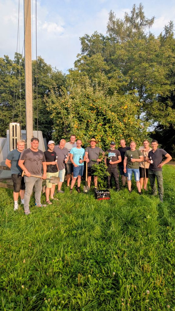 So Begrüßte der 1. Vorsitzende Christian Löbbering seine Vorstandskollegen, die nach der Challengenominierung sich für die Umsetzung verantwortlich zeigten. Direkt an der Vogelstange, wurde die junge Robine gepflanzt.