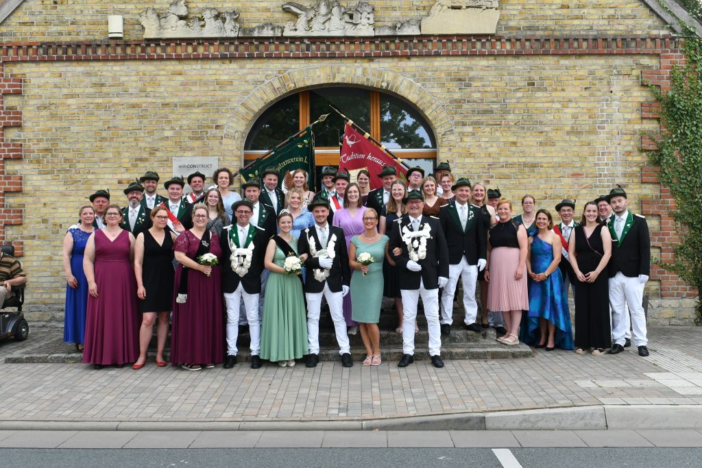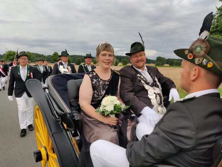 Mit der eigenen Kutsche, die man kurz zuvor bei einer Fahrt zum König der Dörfer geschmiert hatte (wir berichteten), wurden das alte und neue Königspaar Christian Tenkmann und Luisa Feiter sowie Jens und Martina Telgmann von Jannings Quelle ins Dorf gefahren. Auch auf Meldereiter verzichtete man nicht. Es waren Niklas Kerkoff und Matthias Tauber.